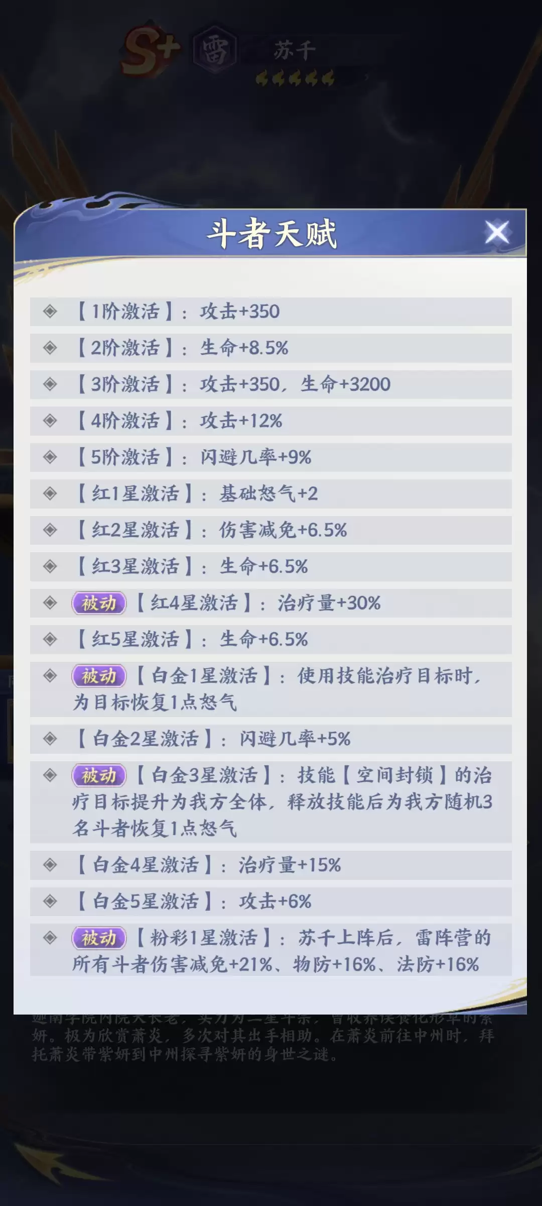 苏千的天赋系统同样值得关注。玩家在提升其实力时,需要着重培养他的天赋属性。在基础阶段,他的生存与输出能力就会得到强化;一旦突破至红阶,他将能更快地释放技能,并进一步强化生存能力。当达到白金进阶阶段时,玩家更可将“空间封锁”升级为全体治疗,并额外获得群体回怒值的强效增益。