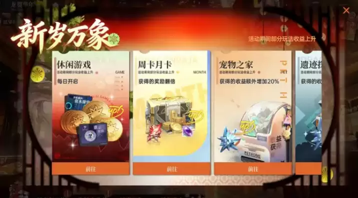 “新岁万象”属于常规收益提升板块。活动期间,休闲游戏每天都会开启,周卡、月卡的奖励将会翻倍,部分玩法的收益也有所提高。这个板块无需玩家进行额外操作,平时怎么玩就怎么玩,奖励自然会比平日更加丰厚。