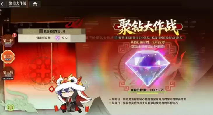 “聚钻大作战”规则稍显复杂,但奖励丰厚。活动一共三轮,每轮分为“聚钻日”和“瓜分日”两个阶段。在聚钻日,全服玩家累计的学分越多,奖池内的钻石总量就越高。到了瓜分日,所有钻石将根据每位玩家在活动期间累计的学分比例进行分配,学分越多,分到的钻石也就越多。