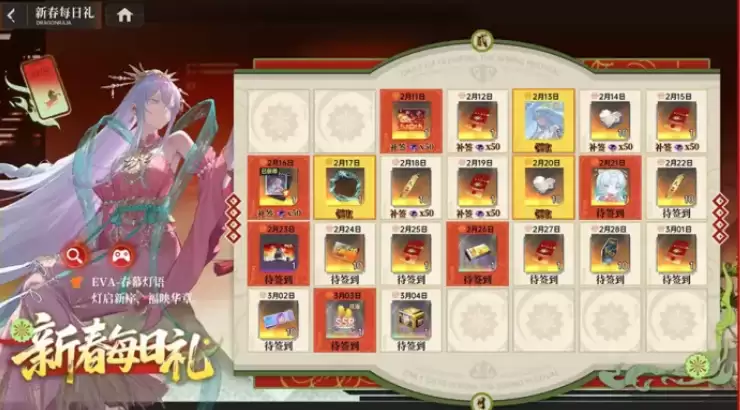 活动期间,玩家只需每日登录游戏,即可在“新春每日礼”板块直接领取丰富奖励。其中包括限定伙伴EVA、皮肤“EVA-春幕灯语”、头像框“龙蟠祈岁”以及EVA头像等。
