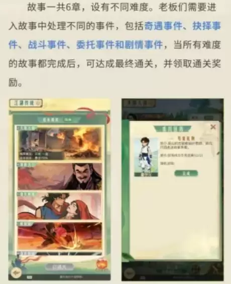 江湖传说这个玩法,是由泥菩萨来引导老板们完成风云的故事。故事一共6章,每章难度不一样,里面有奇遇、抉择、战斗、委托这几种事件。把所有难度都通关之后,可以领到通关奖励。这个玩法不只是为了看剧情,它也是境界突破的条件之一,而且在里面打怪探索会掉落寒铁,寒铁是打造装备的材料,很重要,所以修炼和江湖传说最好同步推进,不要只顾一头。