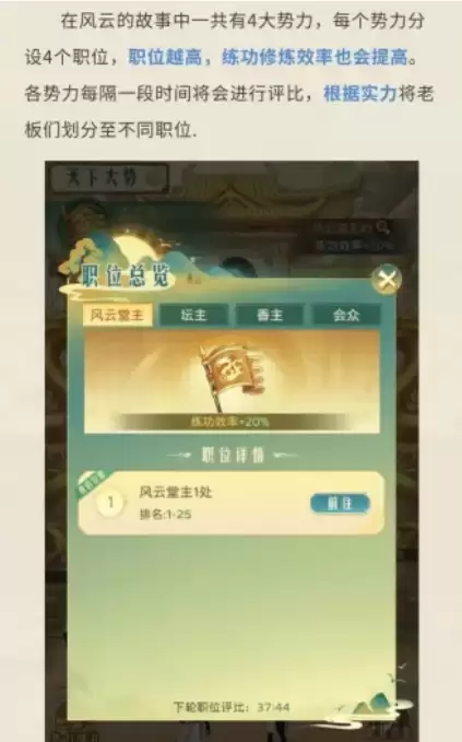 活动一开始,第一件事是拜师。拜步惊云为师之后,修炼这条线才算正式开始。修炼的核心是积攒真气,真气够了,才能提升境界等级。好在挂机也能自动修炼,离线期间不会断,所以不用一直守着。除了挂机,还可以消耗体力让师傅指导,这个方式获得真气的倍率要高很多,尤其是境界高的时候效果更明显。修炼效率还和势力职位有关,职位越高,练功速度越快,所以在势力评比里多争一争,对练功是有帮助的。