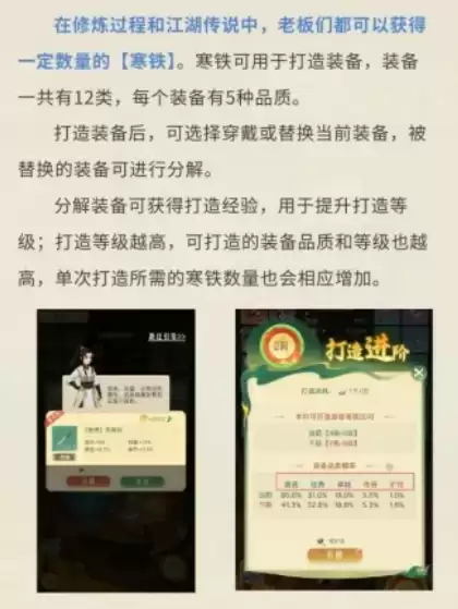 装备这块,寒铁拿到之后就可以去打造装备。装备一共分12类,每类有5种品质,品质越高属性越强。打造等级越高,能造出来的装备上限也越高,不过消耗的寒铁也会跟着涨。装备分解之后能拿到打造经验,用来升打造等级。装备有基础属性和进阶属性,搭配得好可以形成流派,这里建议用闪避加抗暴这个搭配,整体来说比较耐打。装备功法之后,还能解锁怒气技能,在战斗事件里能用上。