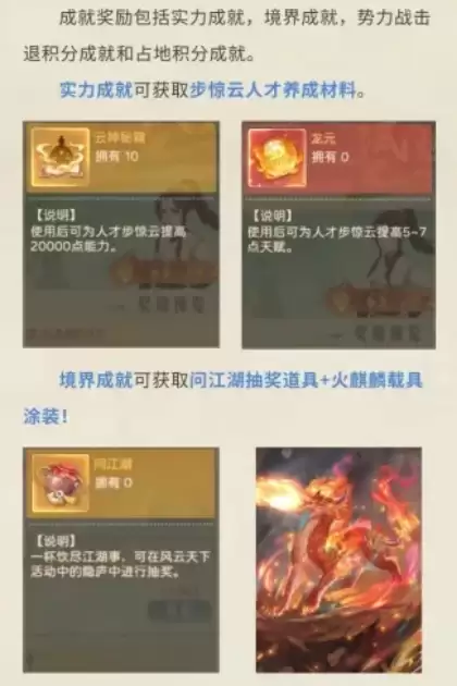 奖励分成就奖励和排行奖励两部分。成就这边,实力成就给步惊云的养成材料,境界成就给问江湖抽奖道具,和火麒麟载具涂装,势力战的击退积分和占地积分成就,也有抽奖道具和养成材料可拿。问江湖抽奖道具,可以去隐庐抽风云限定奖励,人才、服装、风云卡提升道具都有可能出。排行榜方面,境界榜靠境界等级和实力排名,奖励里有专属技能道具、风云天下头像框、风云合璧主角时装。势力战个人榜看总战绩积分,步惊云专属人才信物是主要奖励。势力战势力榜看势力总积分,同势力的玩家,都能分到步惊云养成材料。