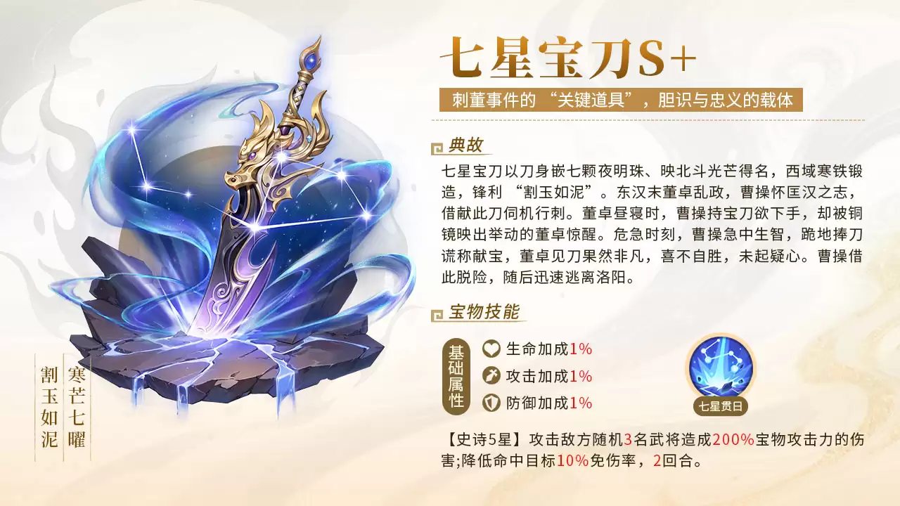 同为S品质的“七星宝刀”,则是战斗型武将的首选宝物。这件阵营宝物是曹操刺董事件中的关键道具,是胆识与忠义的现实化身。装备他的武将同样可以获得1%的基础属性加成,并开启名为“七星贯日”的强力伤害技能。