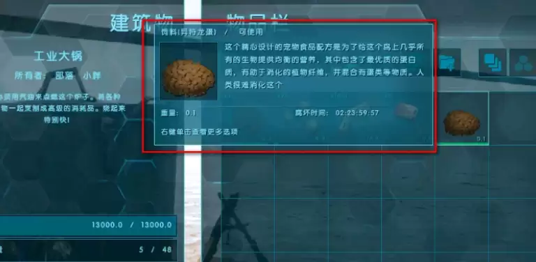 当然,如果你暂时没有异特龙蛋,还有第二个不错的选择——狮鹫蛋饲料。它的驯服效果同样不错,只是所需材料稍多一些:狮鹫蛋1个、优质熟肉1份、纤维10份、土豆1个、玉米1个、柠檬1个、虎尾兰种子1个,外加1瓶水。虽然凑齐材料需要花费些功夫,但对于中前期玩家来说,这也是一个可行的方案。