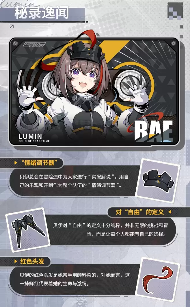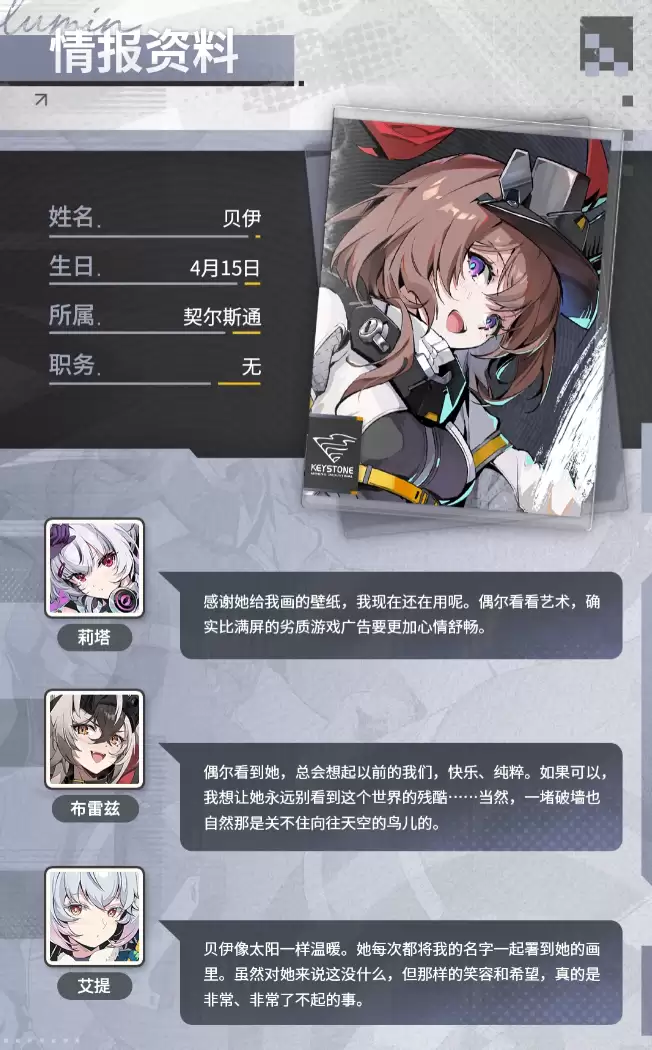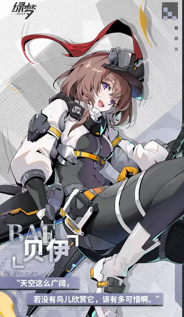 贝伊虽然出生在封闭压抑的侵噬要塞,内心却始终向往着外部的广阔世界。与大多数要塞居民不同,她更热爱与自然为伴,热衷于在未知区域采集环境数据、排查危险源。闲暇时,她会用画笔记录旅途所见——山川、林地以及那些残存下来的人类文明遗迹。因此,在《绿梦:时空之声》中,她不仅仅是一个战斗单位,更是一种精神象征:在荒芜与灾难中,依然保持着对自然的敬畏与对未来的希望。这条情感主线贯穿于游戏故事的发展,在紧张的任务之余,为玩家带来一抹人文气息。