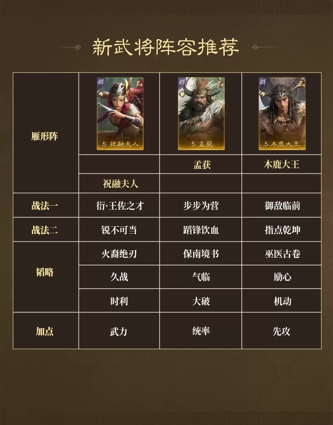 其缘分门槛较低,仅需2人即可激活;若3名夷族武将同时上阵,全队可获得18%常驻减伤。推荐采用全先攻加点+雁型阵配置,确保首回合优先出手,快速削弱敌方核心属性。配合孟获“借刀”机制,可进一步放大压制收益;再衔接祝融的兵刃爆发与韬略巫医的持续治疗,整套体系兼具压制、续航与反制能力,对当前主流兵刃快攻阵容具有显著压制力。