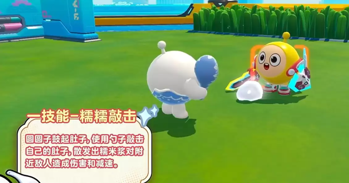 普攻是青花瓷勺,左右挥击对附近敌人造成伤害。没什么特别复杂的操作,就是基础的近身攻击,适合在技能冷却的时候补刀用。一技能叫糯糯敲击。圆圆子会鼓起肚子,然后用勺子敲自己的肚子,把糯米浆震散出去,对附近的敌人造成伤害和减速。这个技能主要用来控制对方的移动,对手被减速之后走不快,后续连招就更容易打到了。近身战的时候先放这个,对方跑不掉,后续输出更稳。
