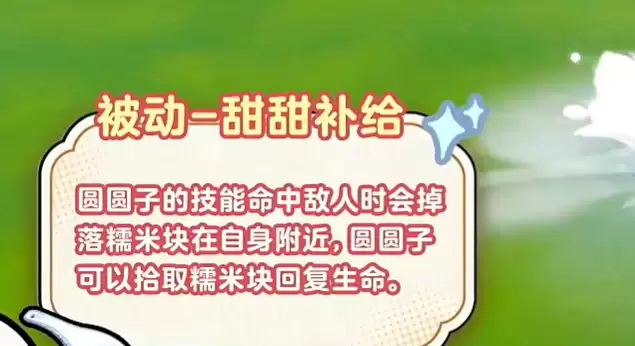 先说圆圆子的被动,叫甜甜补给。这个机制比较特别,技能打到敌人之后,会在自身附近掉落糯米块,然后圆圆子可以捡起来回血。也就是说,只要技能持续打到人,就能一边打一边补血,续航能力很强。更有意思的是,圆圆子的血量越高,体型就越大,技能的覆盖范围也会跟着变大。所以保持高血量不只是为了活得久,还能让技能打出更大的效果,两件事是连在一起的。