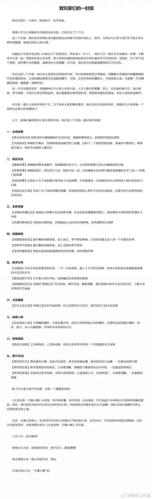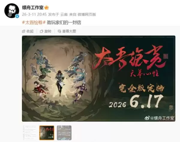 昨日,螺舟工作室通过一封《致玩家们的一封信》,正式公布了国产独立游戏《太吾绘卷》的最新动向。信中确认,神话武侠题材的游戏完整版——《太吾绘卷:天幕心潮》,已最终定档,将于2026年6月17日正式上线。