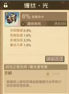 霍夫曼的专属遗物“缠丝光”提供了6%的命中效果加成,并搭配冷却缩减、攻速提升以及充能加速等一系列副词条。这件遗物能够有效满足其作为前排控制兼承伤角色的定位需求。其专属文明“时光之契”可以激活“天罚之日”,迅速提升暴击伤害,让霍夫曼在控制敌人的同时,还能打出可观的输出。