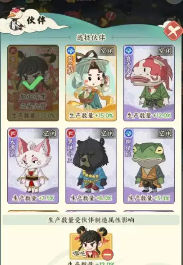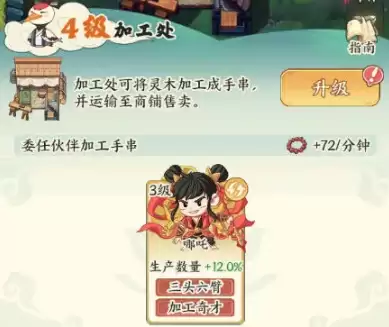在经营过程中,每位伙伴都拥有专属的经营技能,他们所制造的物品属性也各不相同。因此,在移动建筑时,不要随意分配任务。以哪吒为例,他的“三头六臂”在加工处能发挥显著效果,可以有效提升手串的生产数量,堪称一位加工奇才。