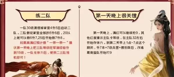 7. 练二队策略:一队30级满建议4级后启动二队,二队满建议5级后可带兵打高级地。主队可靠经验书升级,一队没体力后二队挂机。