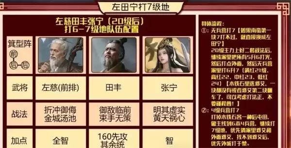 4. 左慈田丰张宁攻打7级地:20级后组队,配备折冲御侮、金城汤池等战法。优先攻打内城邓艾,如果红度不够可以考虑打外城于禁。