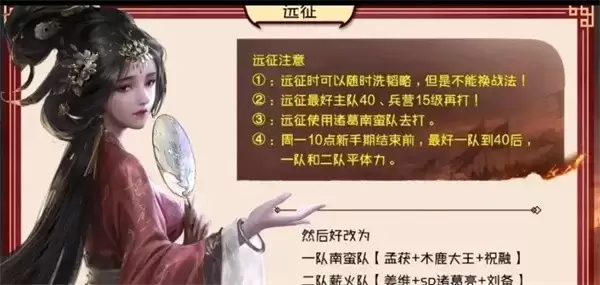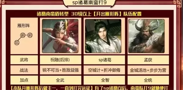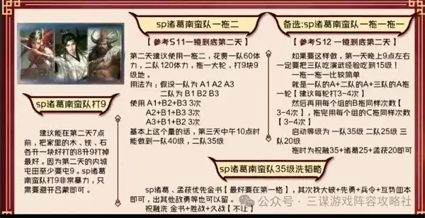 6. SP诸葛南蛮队攻打9级地及后续:SP诸葛加入后南蛮队强度提升,还可用于一拖二/一拖三。35级后可洗战法,远征也用该队。新手期结束前尽量让一队达到40级。