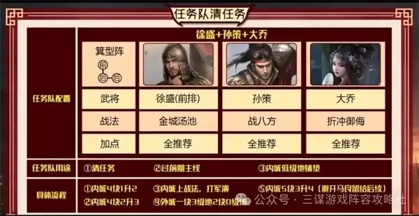 1. 任务队伍配置:推荐使用徐盛、孙策、大乔组成的“孙大圣”队伍。按照内城升级、打军演、外城打地的流程完成任务。需要注意的是,马良队伍应该保留给后续队伍使用。