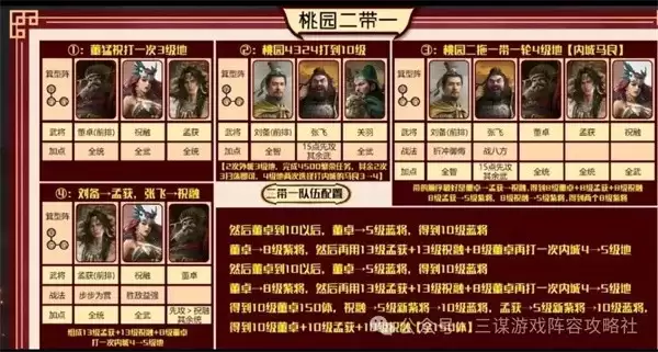 2. 桃园二带一策略:建议先使用董卓、孟获攻打3级地,随后上阵刘备、张飞、关羽的桃园队。升级后通过武将置换,最终得到10级左右的董卓、孟获、祝融,为南蛮队铺路。