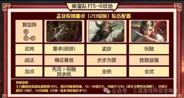 3. 南蛮队攻打5-6级地:配置董卓(横征暴敛)、孟获(步步为营)、祝融(胜敌益强)组合。在16-17级左右可以攻打内城5-6级地,优先选择文聘、刘晔,如果红度不够可以提升一级再尝试。