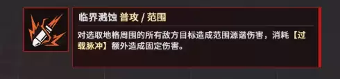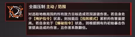 主动技能1“全面压制”是一个范围伤害技能,能够选取目标格子周围的所有敌方单位进行打击。这个技能的关键在于其效果会根据OTs14当前所处的指令状态而变化。在掩护指令下,技能累积的伤害量会得到提升;而在爆破指令下,伤害系数直接翻倍,并且会根据初始暴击伤害额外提升输出。两种状态下的效果差距明显,因此在使用这个技能前,务必确认当前所处的指令状态。