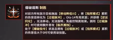 制胜技能“爆破裁断”会对前方所有敌方目标施加移动降低的效果,同时将指挥模式累积的伤害值转化为“过载脉冲”。使用后,OTs14会进入“逆反同化”状态,此状态下无法移动和旋转,但可以免疫控制效果。只要拥有过载脉冲,就能使用额外普攻。这个制胜技能的节奏感较强,基本流程就是前期通过指令累积伤害,然后一次性爆发出来。