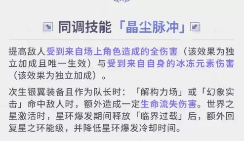 超限武器「苍雷星梭·初号协议」解锁之后,同调技能「晶尘脉冲」会提高敌人受到场上角色的全伤害,这个是独立加成,同类效果只有一个生效。次生银翼装备且当队长时,「解构力场」或「幻象实击」打中敌人,会额外造成生命流失伤害。世界之星激活状态下,星环爆发期间放完「临界过载」,还能额外回复星之环能级,星环爆发的冷却时间也会缩短。