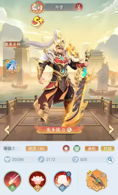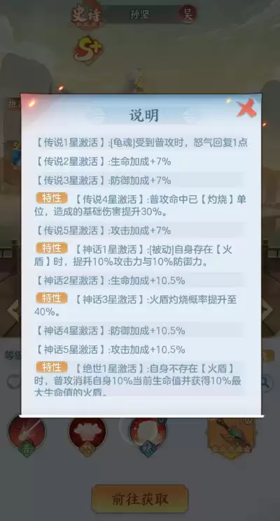 在达到传说1星的时候,孙坚可以通过这里归魂的能力来让自己使用普攻的时候得到更多的怒气加成,而后期再利用他后期提升的各种怒气恢复效果当中也可以给已经有灼烧效果的单位,造成解除能量提升的效果,所以孙权身上不存在护盾的时候,后期在有经济提升了之后,孙坚他还可以根据这里普攻能力,消耗自身10%当前生命数值,然后获得一个10%最大生命数的火盾来消耗自己能力搭配了足够的防御之后,整体阵容里面大家就要注意建议给他搭配一个灼烧流阵容。