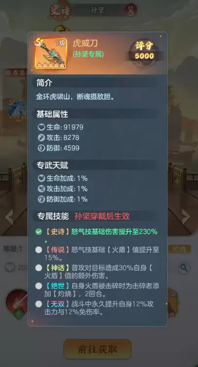 不管是阵容里面需要的灼烧也好,还是单体输出需要的灼烧持续伤害也好,完全可以搭配起来孙坚,孙坚在这里作为阵容前排的话,大家也要记得给他搭配一个虎威刀,这样在这种效果里面他才可以根据自己的怒气技能带来基础伤害的提升,这里一次性的提升数值都达到了230%,后期在传说品质的时候,他通过这个活动可以给怒气技能带来15%的提升,怒气技能当中的火盾带来更多防御效果之后,他放在灼烧队前排里面,也可以保证我方灼烧队有更强的生存效果。