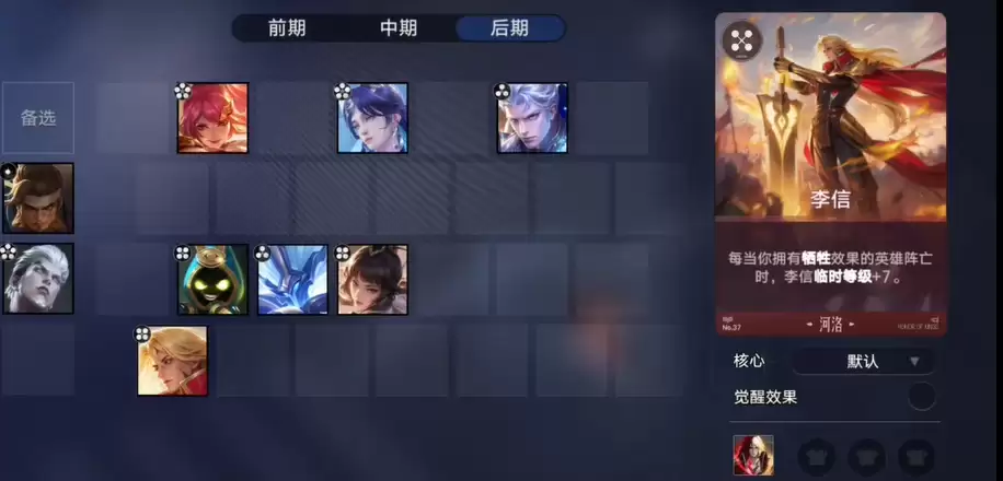 在最后的阶段,可以选择一些具有坦克效果的英雄,但是在后期的英雄选择上相对来说还是比较自由的,只要血量充足就能够搭配李信和阿离一起躺赢。后期选择的选手们可以安排在前排进行扛伤,如果遇到无法招架的伤害时,李信和阿离再上场。