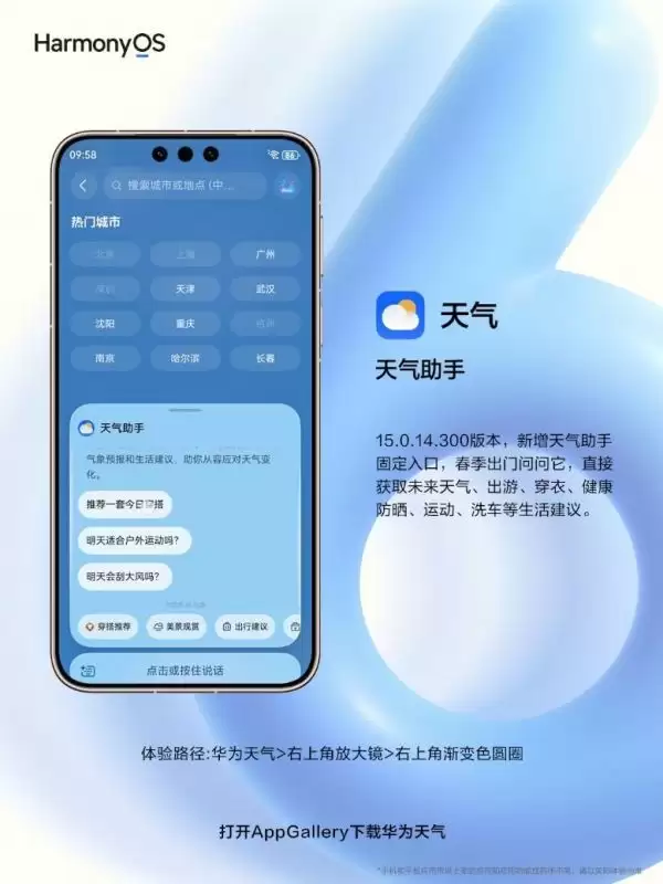 从具体到街道的未来48小时天气地图,到24小时在线的贴心天气助手;从可个性化定制的桌面指数卡片,到防患于未然的过敏提醒,华为天气15.0.14.300新版正陪伴我们迎接每一个明媚春日,以及未来的夏秋冬。在刚刚结束的华为春季全场景新品发布会上,新推出的华为畅享90系列手机已自带这些实用功能,新机体验更为便捷。或者,您也可以将现有手机系统升级至HarmonyOS 6,随后打开应用市场搜索“华为天气”,下载或更新至15.0.14.300版本,即可立即开启你的春日舒心之旅!