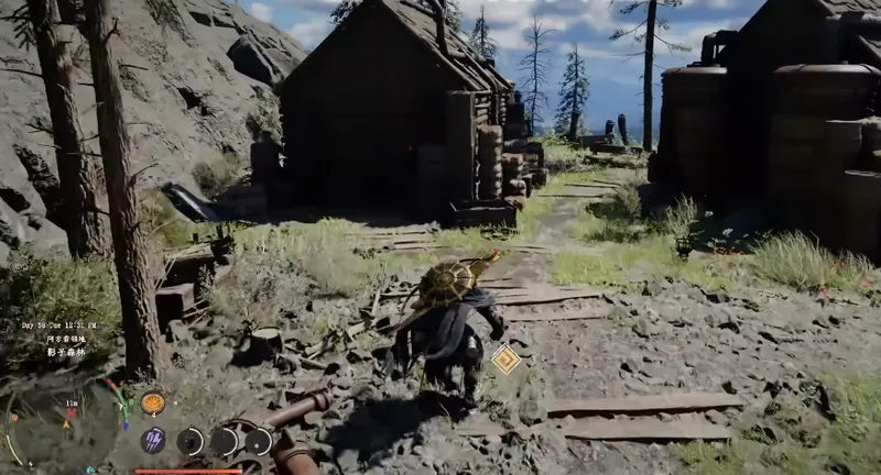 抵达这片木屋区域后,你的目标非常明确:请径直进入右侧的那间木屋。