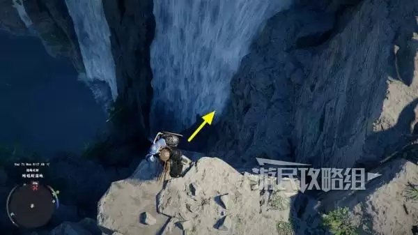 行动路径如下:首先根据区域地图导航至巨大瀑布坐标点。抵达后,请定位至右侧的第一道瀑布水流,并在其边缘向下观察,可见一凸出的岩石平台。准确降落在该平台上。