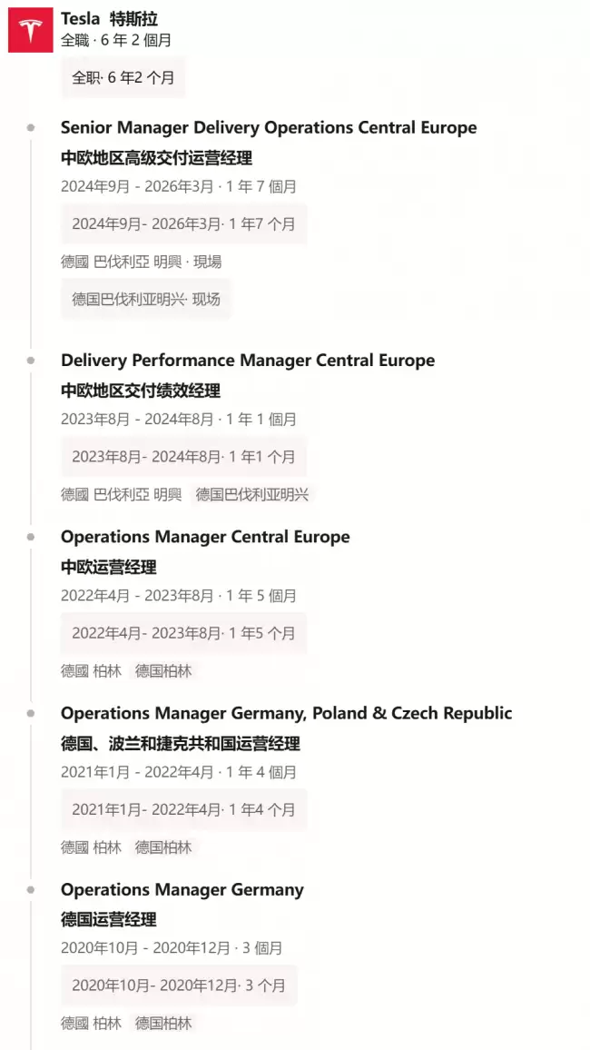 洛伦茨的履历印证了这项任命的关键性。在特斯拉的六年,他先后主导中欧运营、德国市场管理及区域运营主管等核心职务,全程参与了特斯拉在德语区乃至欧洲的渠道搭建、交付流程优化与运营体系标准化,其经验具备极高的实战价值。