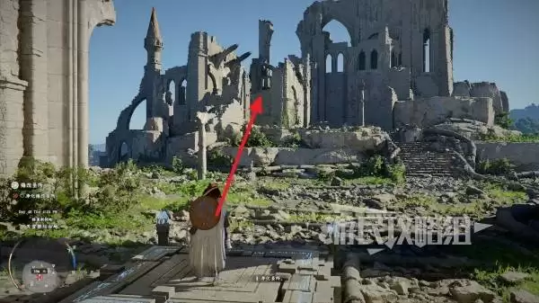 翻越此矮墙后,继续向前探索,找到更高一层的平台结构并攀爬上去。