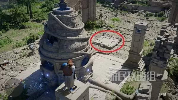抵达圣所后,您会看到一个中央圆顶与环绕的四根方形石柱。注意,其中一根石柱的顶部遗失了一块方形石砖。您的核心目标就是找回并归位此石砖。