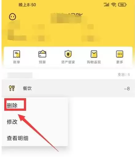 打开鲨鱼记账后,点击“记账”。进入记账,选择要删除的记录。进入下拉,点击“删除”。 打开鲨鱼记账后,点击“记账”。 进入记账,选择要删除的记录。 进入下拉,点击“删除”。