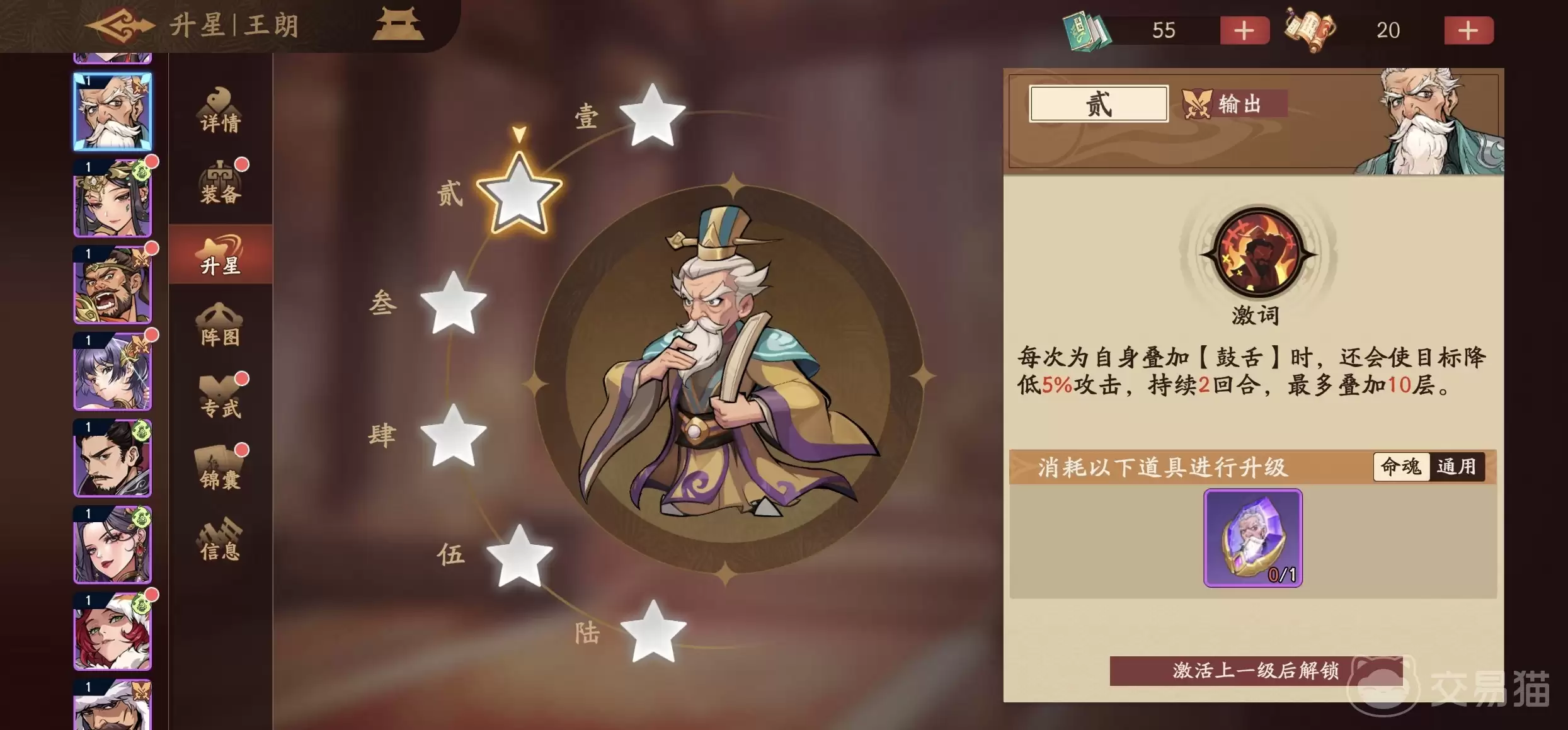 作为紫将,王朗的基础面板虽不及顶级橙将、红将,但其技能组提供了显著的动态成长空间。其必杀技对敌方单体目标发动攻击,命中后有概率施加一层“鼓舌”状态。关键在于博弈:若此次未能成功附加“鼓舌”,则王朗自身会获得一层“饶舌”。