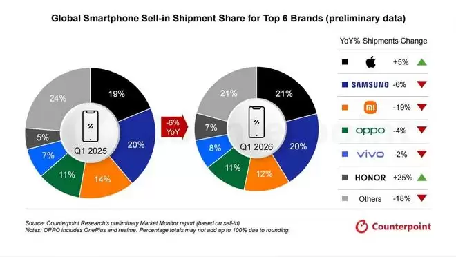 2026年Q1全球智能手机出货量同比下滑6%,荣耀与苹果逆市突围 来源:环球网 Counterpoint Researc