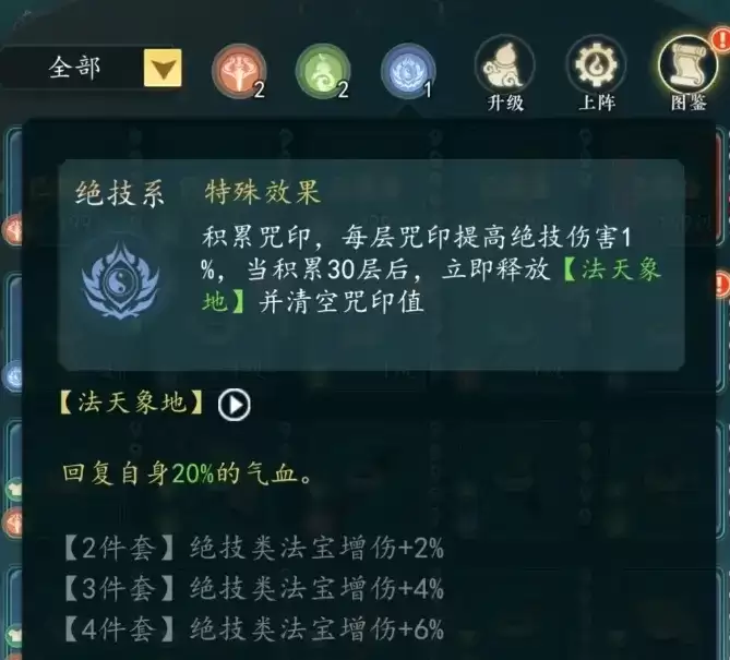 三大体系的差异根植于其独特的被动积累机制。飞剑系法宝每次释放会叠加一层“剑意”,叠满30层后触发剑气,造成范围伤害并附加沉默效果,兼具输出与控制。道法系法宝则积累“真气”,真气满30层后,为下一次攻击提供20%的额外伤害加成,是纯粹的爆发增幅器。绝技系法宝的核心是“印咒”,印咒累积至30层可瞬间回复自身20%气血,提供了强大的生存与续航保障。