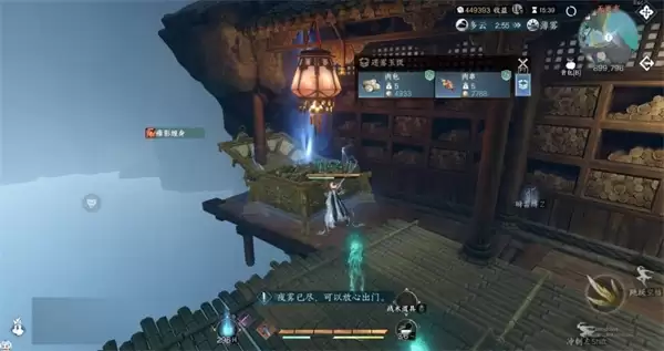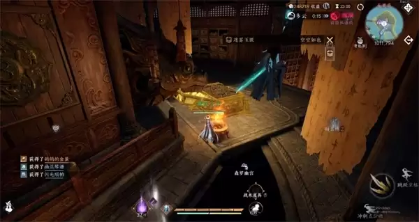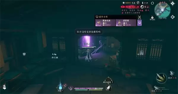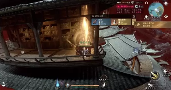 2. 楼梯大宝箱:坐标(1067, 804)。到达鬼话斋正门后,向上观察。使用“承影剑”技能到达上层,沿建筑外缘行走至外部楼梯的尽头即可发现。