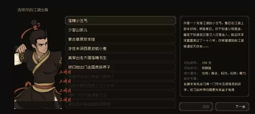 各位刚出道的朋友,这次咱们要从一个标准的“开局一条狗”剧本玩起——说错了,是开局一个小乞丐。这里有个关键点我得特别提醒你:角色的道德值啊,一定要小于或等于5。这可不是我瞎讲究,因为后面你想拉“江南鬼手”入伙的话,道德高了人家根本不理你。至于其他属性,你就按自己顺手的来加吧,自由度还是有的。