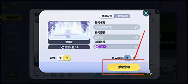 5、按需设置房间。 进入创建页面后,我强烈建议你设置一个密码。这就像给房间加把锁,能防止不认识的路人蛋仔突然闯进来,确保你们的小团伙可以安心练习。其他参数比如队伍人数什么的,也可以按你们的需求调一调。最后,点击【创建房间】。