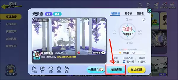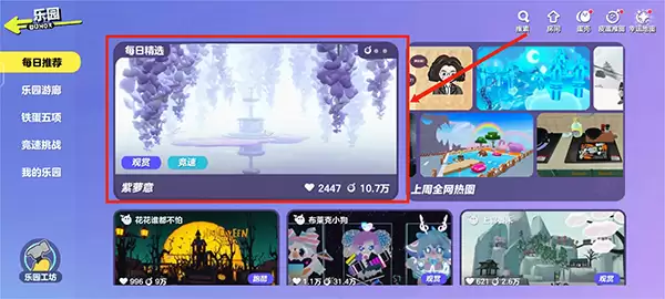 3、挑选心仪的地图。 乐园里面的内容可丰富了,像“乐园游廊”、“每日推荐”、“铁蛋五项”这些栏目,都藏着超多好玩的地图。根据你和朋友的喜好,慢慢逛、慢慢选,找到合眼缘的那张点开就好。话说回来,“铁蛋五项”特别适合用来练综合身法,我常跟固定队的朋友去那里“受虐”。