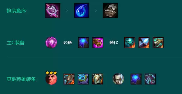 这套阵容可以拿1-2件奥恩装备。大眼需要回蓝装+法爆两件套,第三件选冥火/狙击手/收集者。乌鸦必须带离子火花,第二件做狂徒或板甲单抗。奥恩装备拿破舰者/绿甲/永霜。诡术师之境可以前期过渡,后期给皇子。魔蕴可以给希尔科或替换大眼的回蓝装。