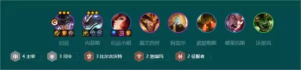 首先给大家推荐这套【433主宰尼菈】,4主宰3比尔吉沃特3司令的配置。说实话,这套阵容成型后的强度相当离谱,几乎能跟任何主流阵容掰手腕。