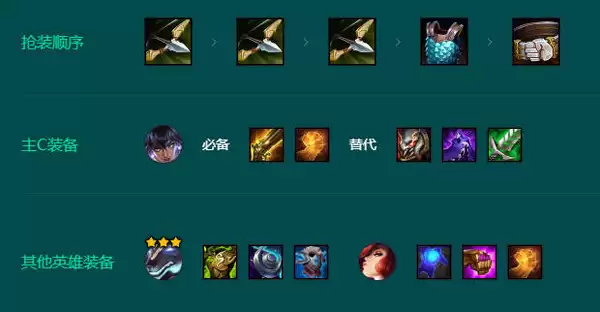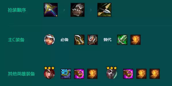 装备优先保证奇亚娜的三神装。然后观察卡特和艾克谁来的多,谁更容易三星就给谁做装备当副C。这两个单位的装备思路基本一致。
