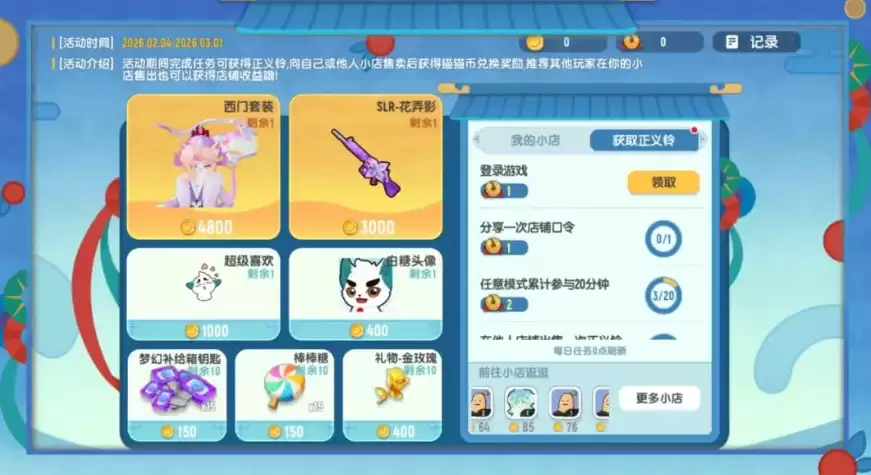 让我来给你们划重点:这次活动的核心就是“正义铃”道具和“猫猫币”经济系统。你通过完成日常任务拿到正义铃后,可以在个人小店上架售卖;其他玩家购买后,你就能赚到猫猫币。有意思的是,如果有人在你店里完成交易,你还能额外获得猫猫币加成——这设计让我想起了现实中的店铺引流,不得不说挺用心的。