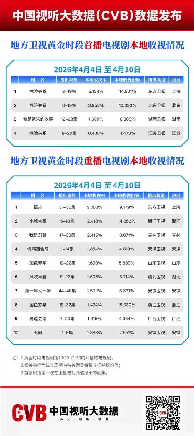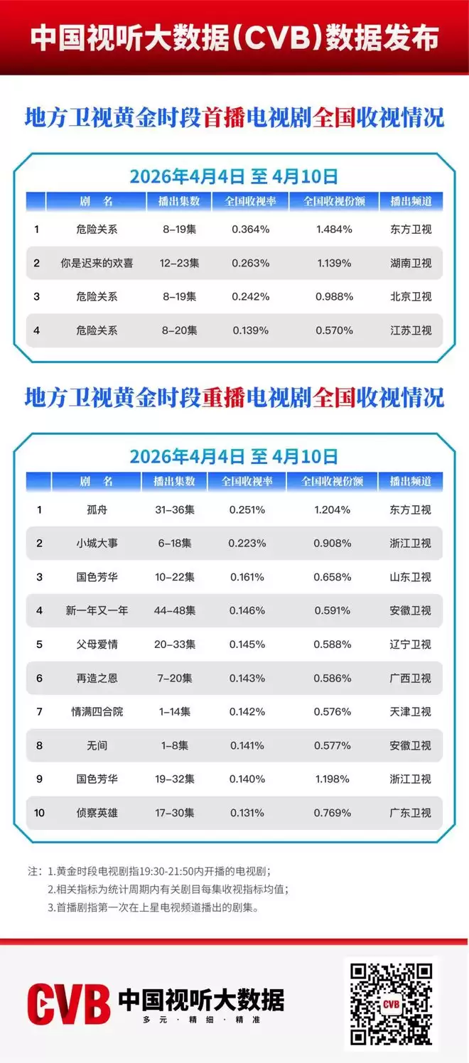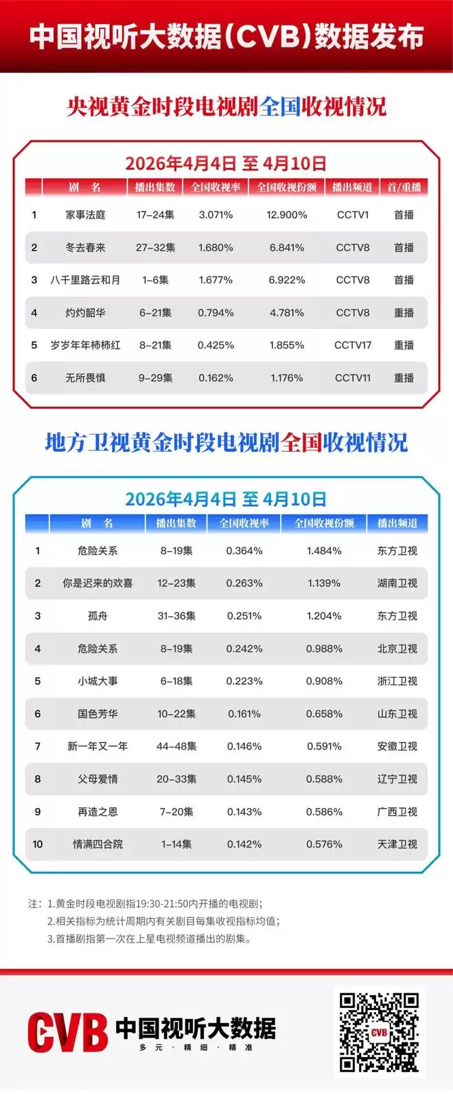 CVB收视周报权威发布:2026年4月4日至10日黄金档剧集收视全景 最新一周的CVB收视数据已出炉
