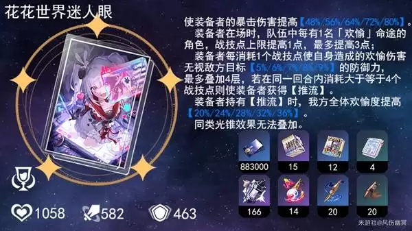 月卡武器,是非常不错的四星毕业选择之一。提供暴击率还能提升欢愉度,属性和效果都非常贴合。