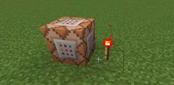 2、接下来就是激活它。把得到的命令方块放置在地上,然后在它旁边放上一个红石火把。红石火把提供的信号,就像是给命令方块通上了电,让它进入待命状态。